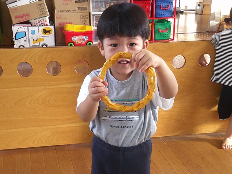 先日はさみを使って細長い紙の一度切りにチャレンジしました。゙ぐーぱー、ぐーぱー゙と指を動かして真剣な表情で取り組み、一回切れる度に「切れた!」と大喜びでした。これからも色々な作品を作る中で、はさみを使っていきたいです。 |