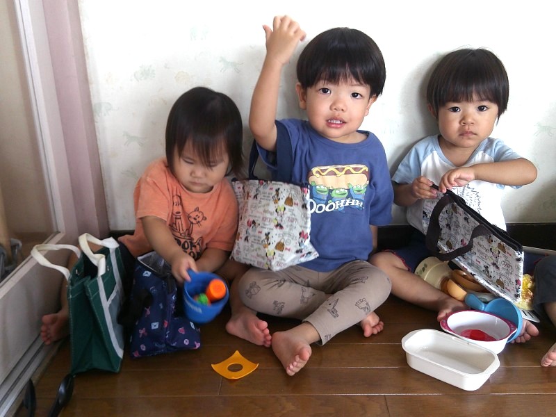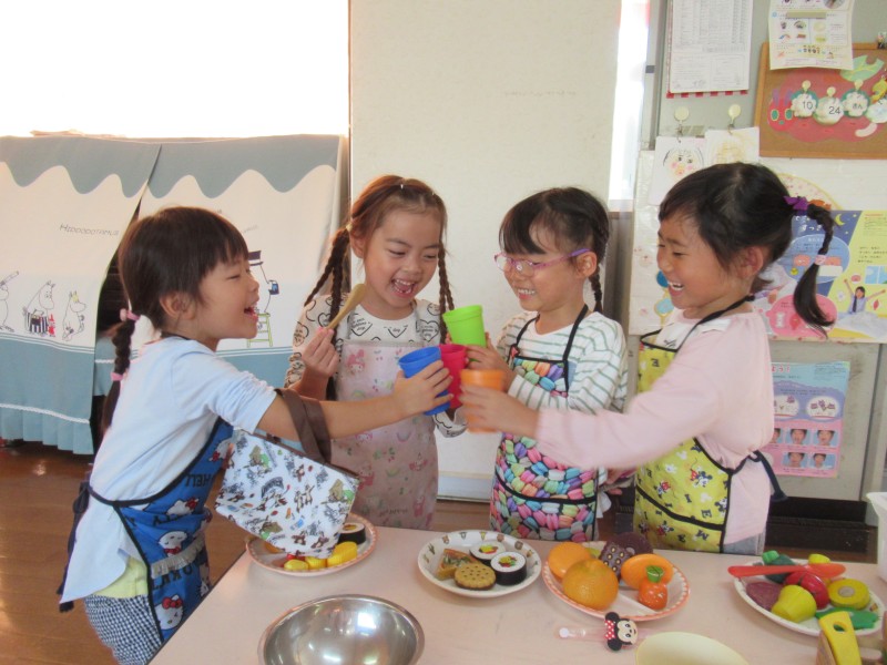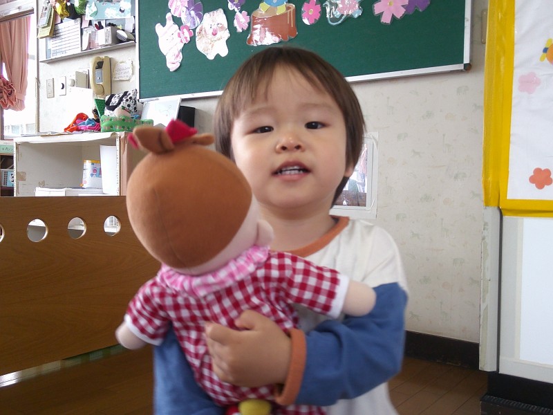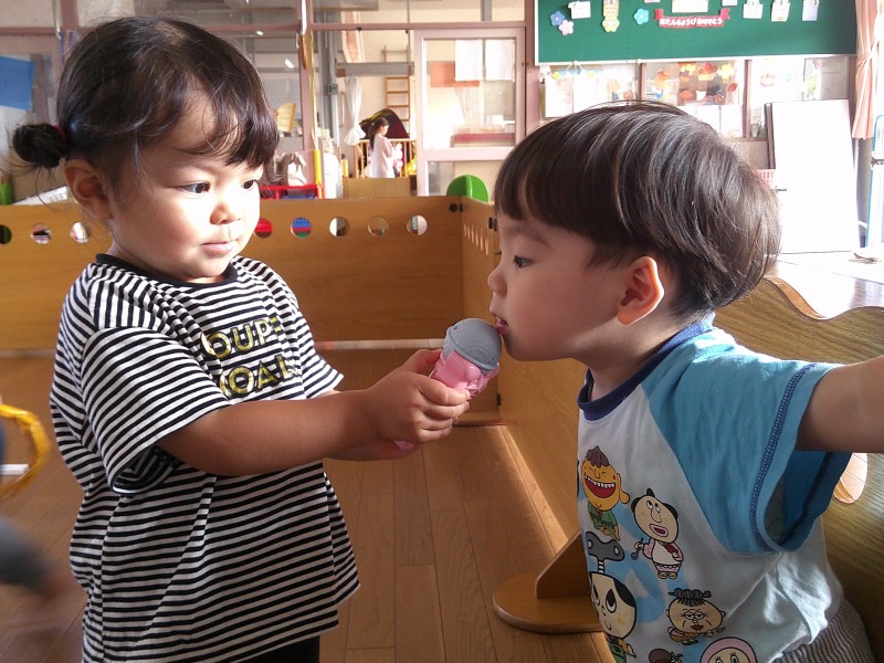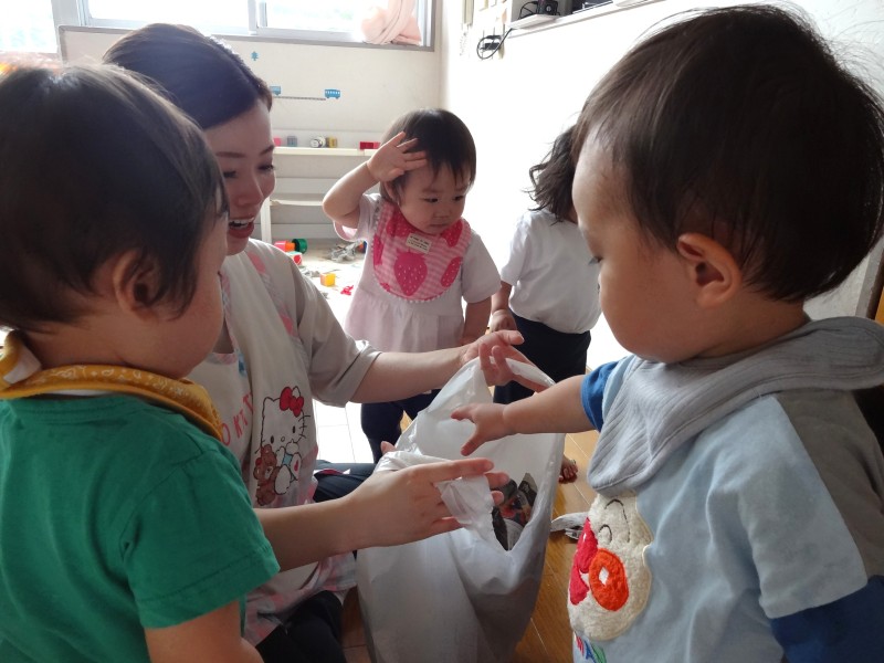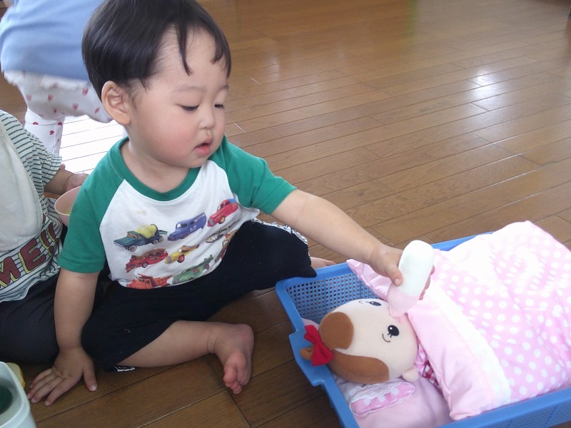 ごっこあそびブーム到来!赤ちゃんの人形を見つけるとお父さん、お母さんになったり、輪っかを手に取ると運転手に変身したりしています。ごっこあそびを通して友だちとのやり取りも活発になり、あそびが広がっています。 |