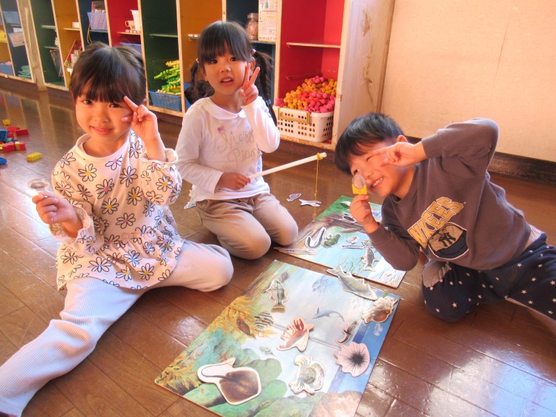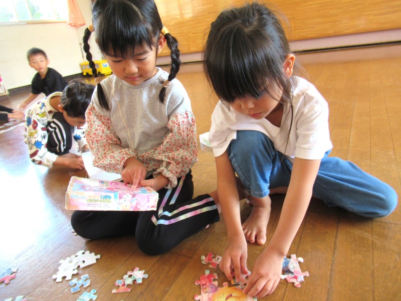 就学に向けて9月から午睡(昼寝)をしなくなった分、その時間は室内あそびを満喫しています。子どもたちに一番人気なあそびは「ラキュー」色々な色のパーツを上手に組み立てて、大人が思いもしない作品が次々と出来上がっています。子どもたちの自由な発想力にはいつも感心させられます。 |