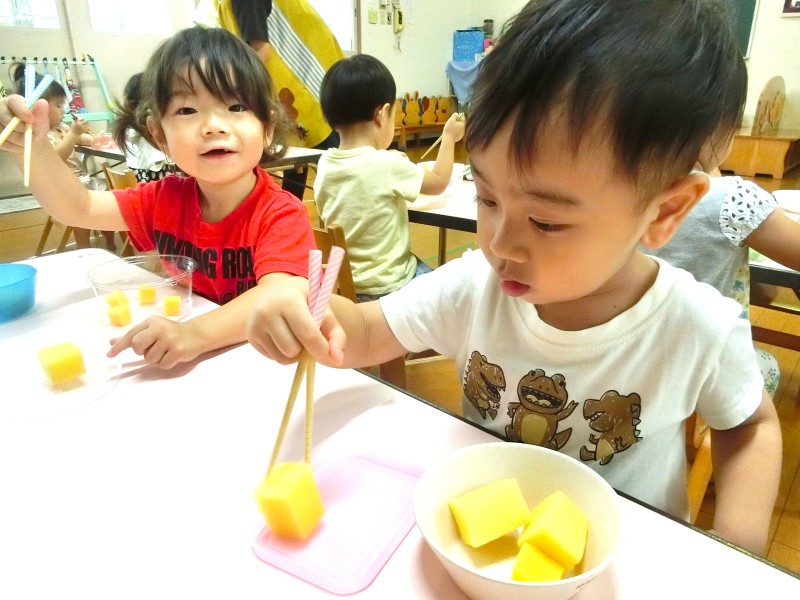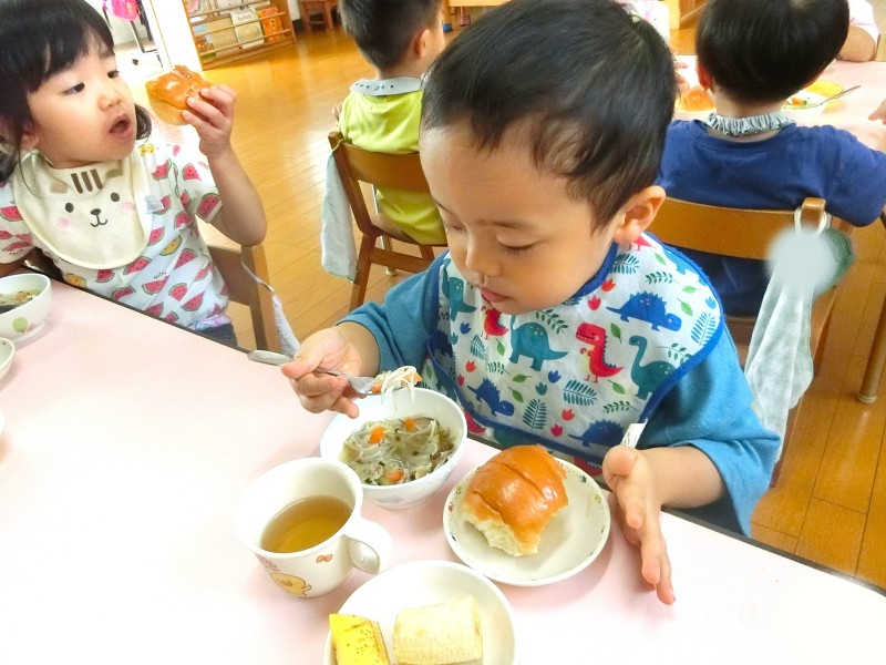 子どもたちが大好きな美味しい給食の時間ですが、スプーンやフォークを上から握って食べていた子どもたちも徐々に下から持って食べられるようになってきました。「バキューンの持ち方ね」の声かけをしなくても自分たちで意識出来るようになってきたので、次はお箸に移行出来たらいいなと思っています。 |