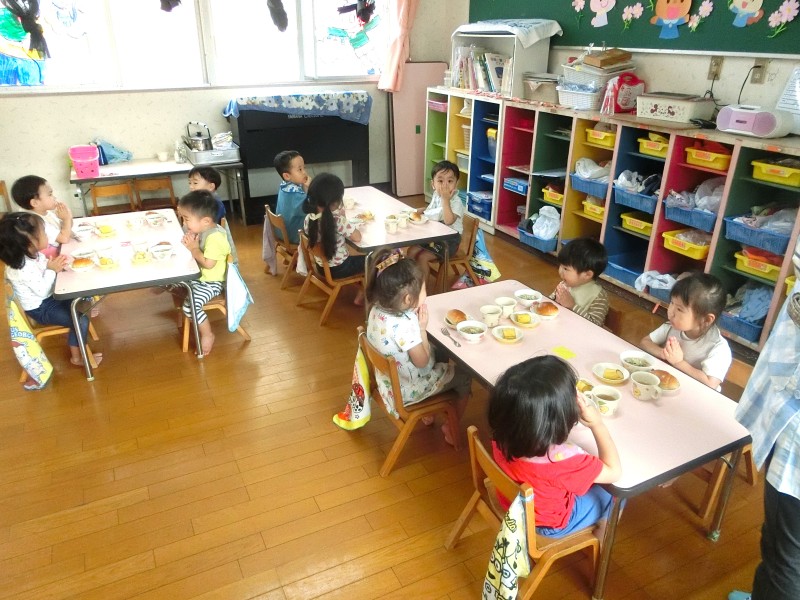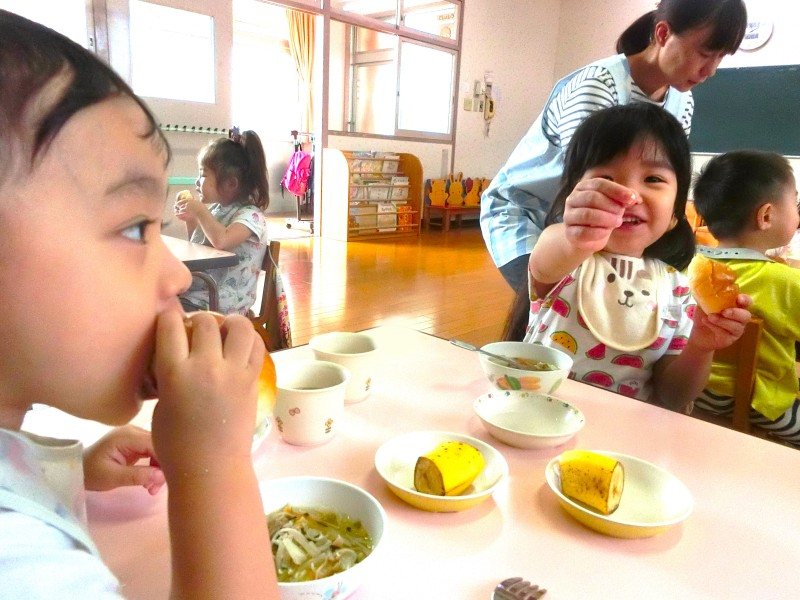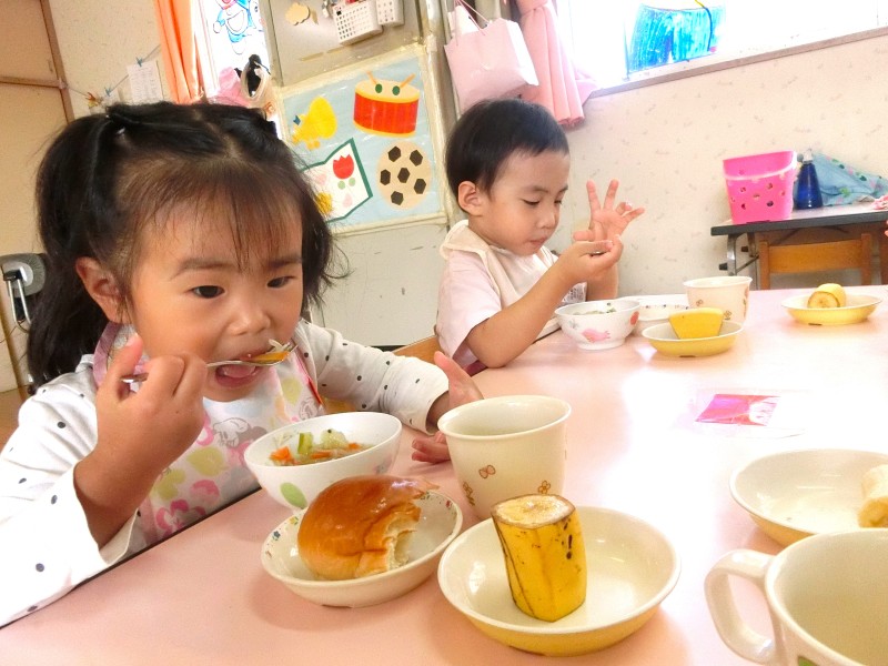 食欲の秋♪給食の時間になると「いただきます」「おかわりください!」という元気な声が聞こえてきます。お箸の持ち方も意識しながらたくさん食べていますよ! |