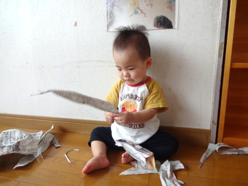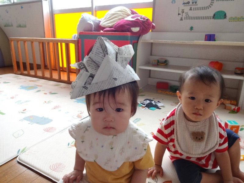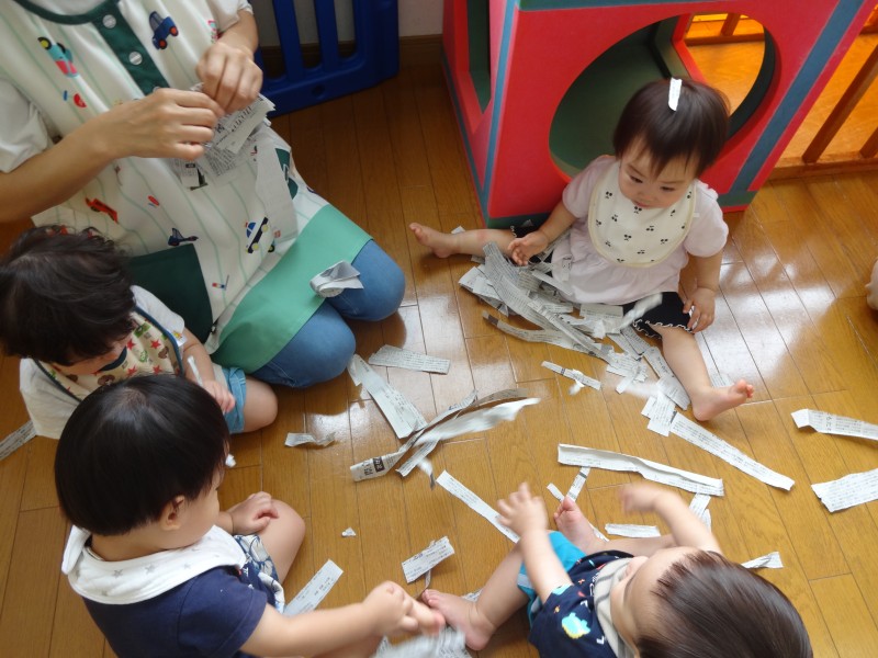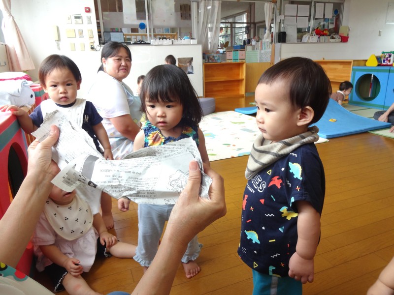保育教諭が新聞紙を広げて見せると子どもたちは興味津々!びりびり破れる新聞紙を不思議そうに見て、真似ていました。雨のように上から降らせてみたり、帽子にしてみたり…たくさん楽しみました♪ |