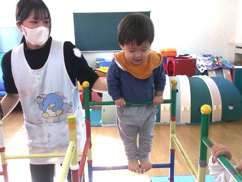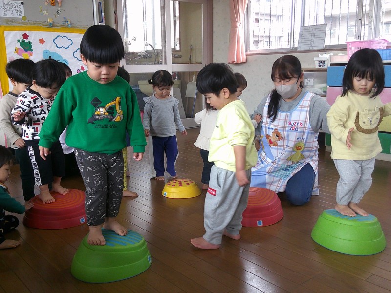 日に日に活発さが増し、跳んだり投げたり登ったりして元気いっぱいあそんでいます。初めてのことにもやる気満々。高い所は少しドキドキするけれど、それでも嬉しくて何度もくり返していますよ。これからも室内外でたくさん身体を動かして楽しんでいきます。 |