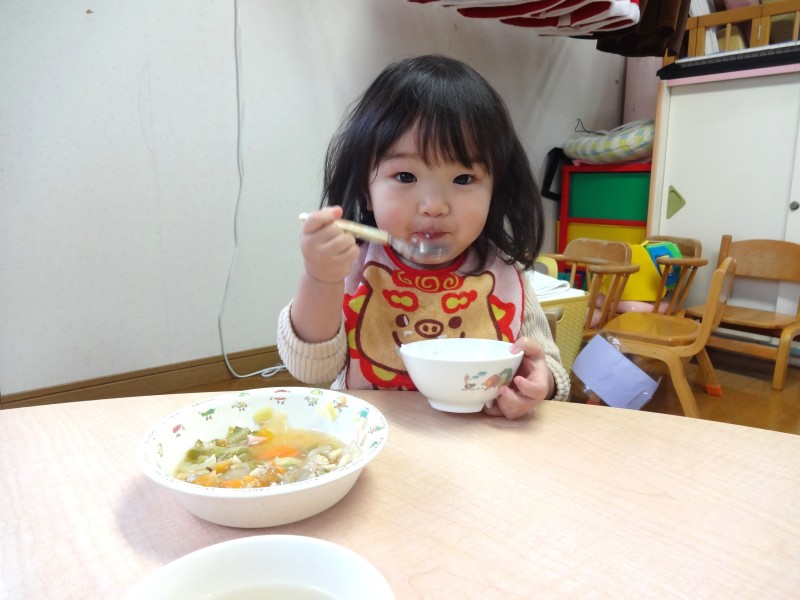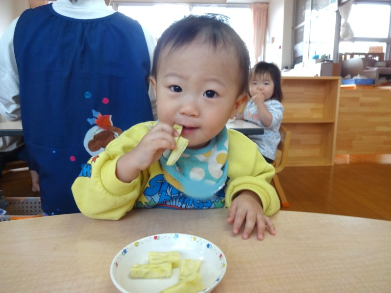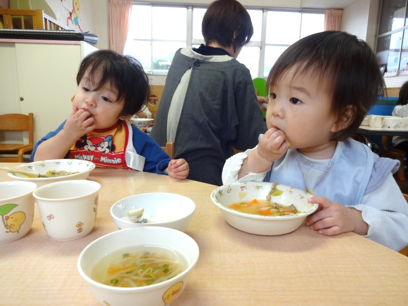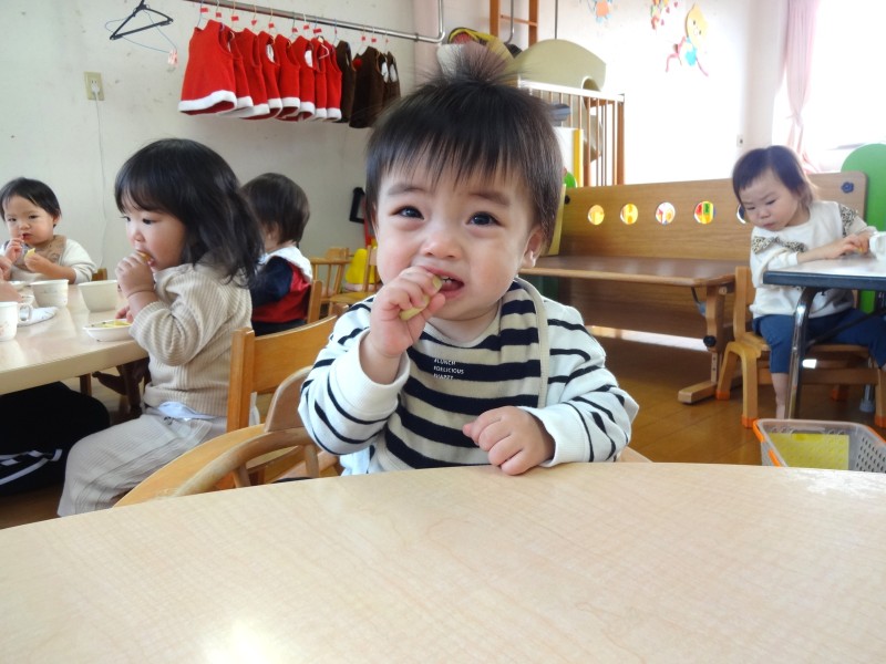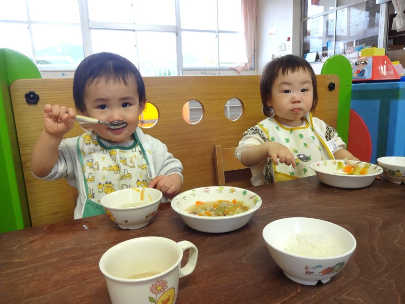 ちゅうりっぷ組の給食タイム第2弾です!約半年前は手づかみで食べていた子どもも自分でスプーンを使えるようになりました。おやつも口に入れてもぐもぐと噛める量を手に持てるように援助しています。どんどんできることが増えて、すくすく成長中のちゅうりっぷさんです☆ |