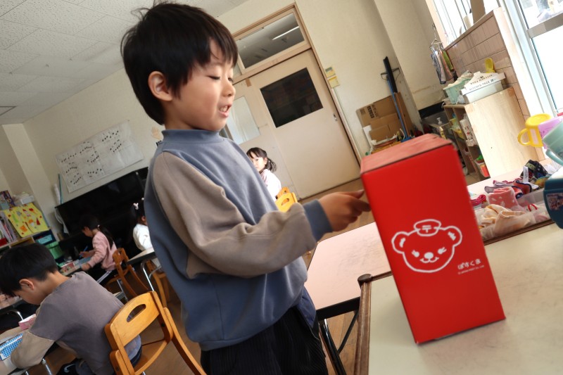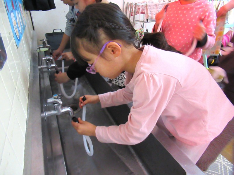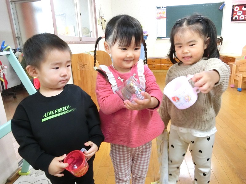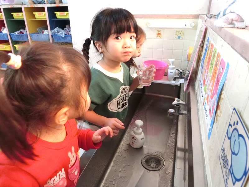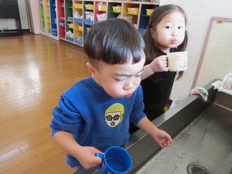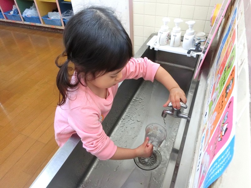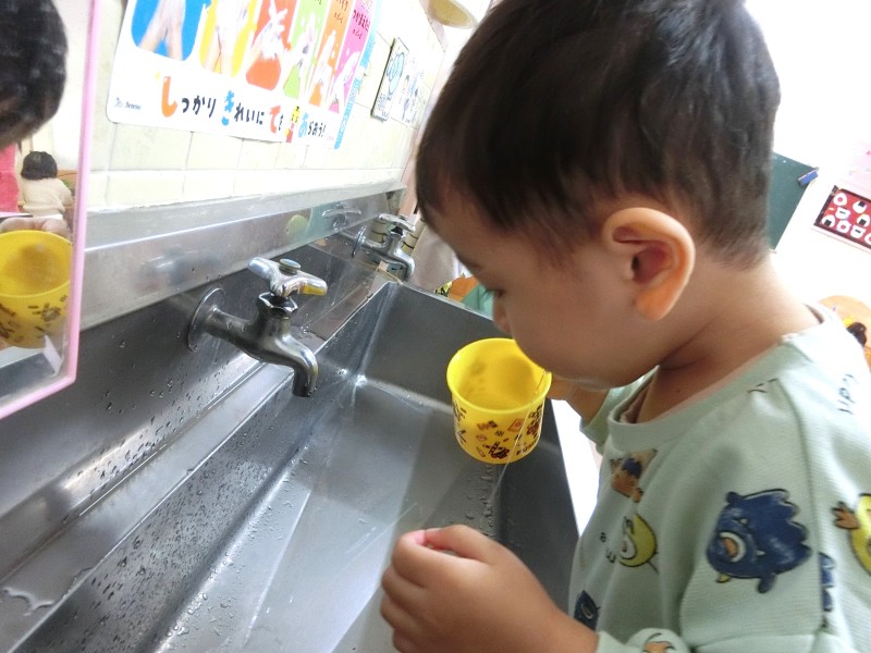 自分のコップを使って、食後のうがいを始めました。“自分の”が嬉しくて「見て、かわいいでしょ♡」「ぼくのはこれ!」と保育教諭や友だちに見せています。うがいも自分で水を入れて、ブクブクとほっぺを動かして、ぺーっと出せていますよ。 |