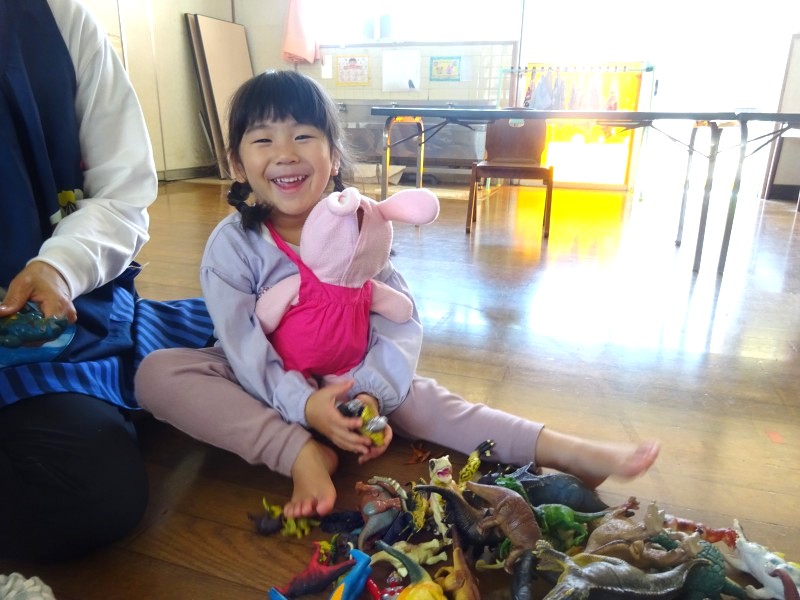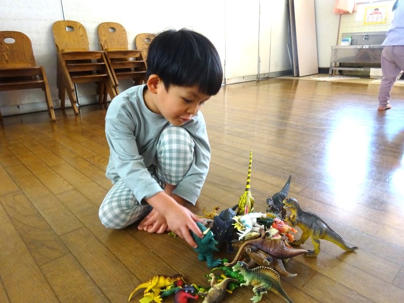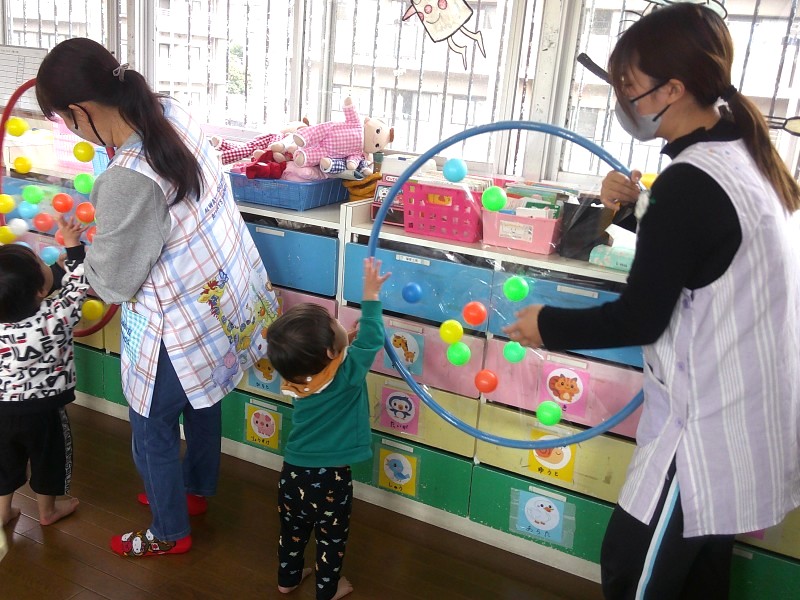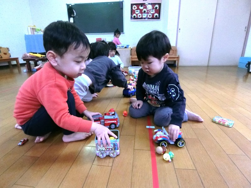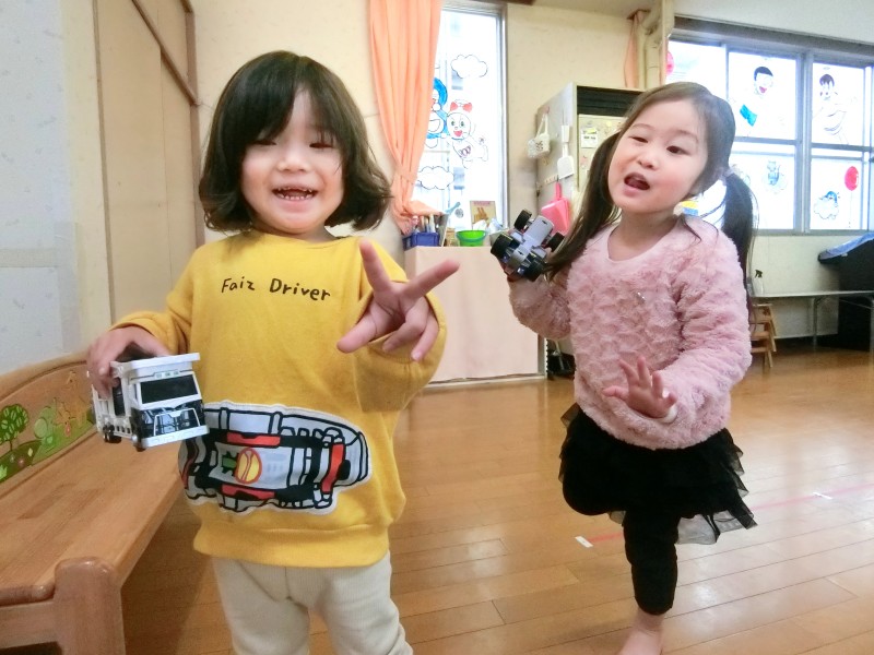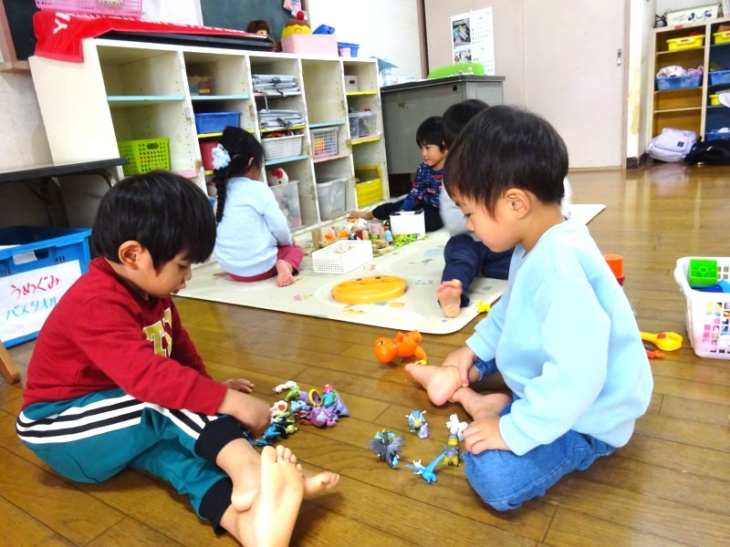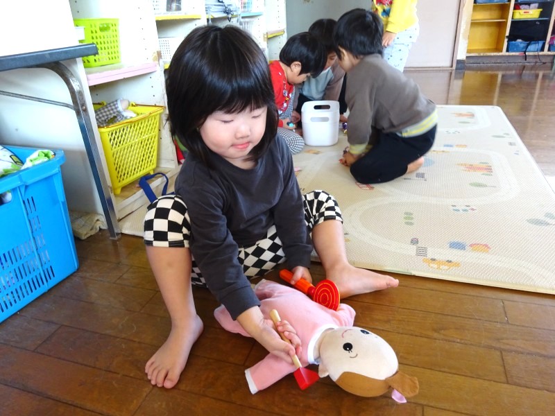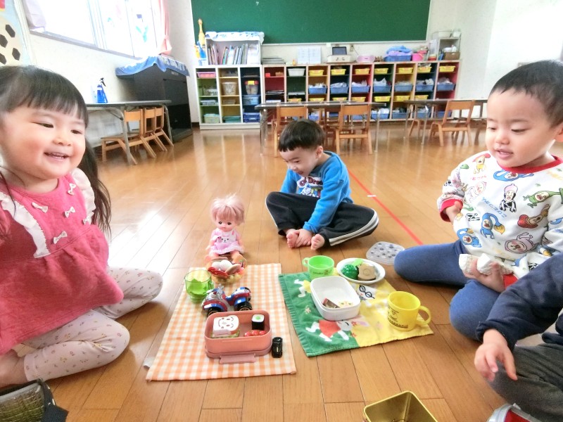 ごっこあそびブーム到来!赤ちゃんの人形を見つけるとお父さん、お母さんになったり、輪っかを手に取ると運転手に変身したりしています。ごっこあそびを通して友だちとのやり取りも活発になり、あそびが広がっています。 |