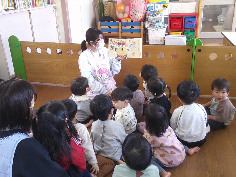 保育教諭が絵本をよむ準備をはじめると、続々と子どもたちが集まってきます。おはなしの中で知っている動物や食べ物が出てくると声を出して反応して楽しんでいますよ♪絵本の時間をとっても楽しんでいるちゅうりっぷぐみさんです。 |