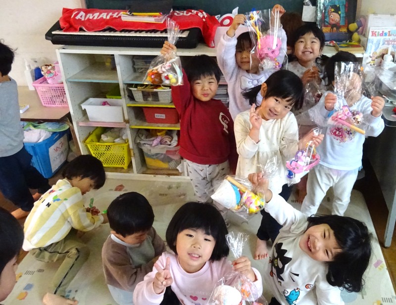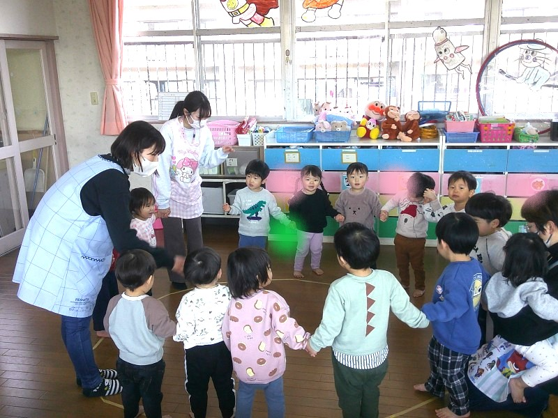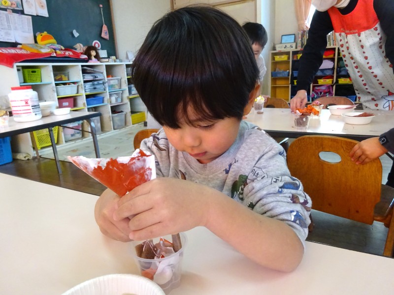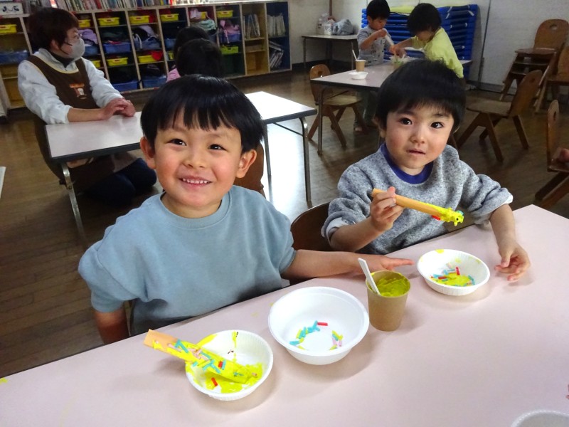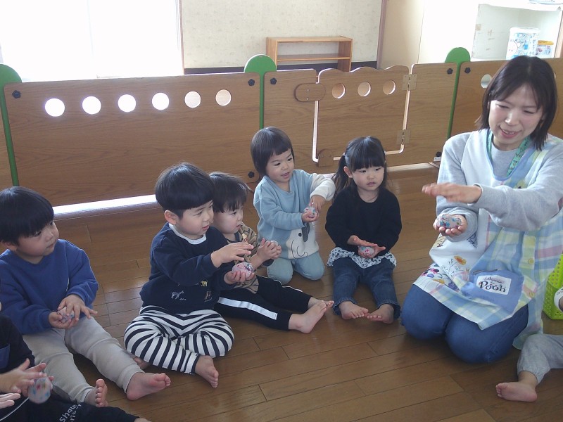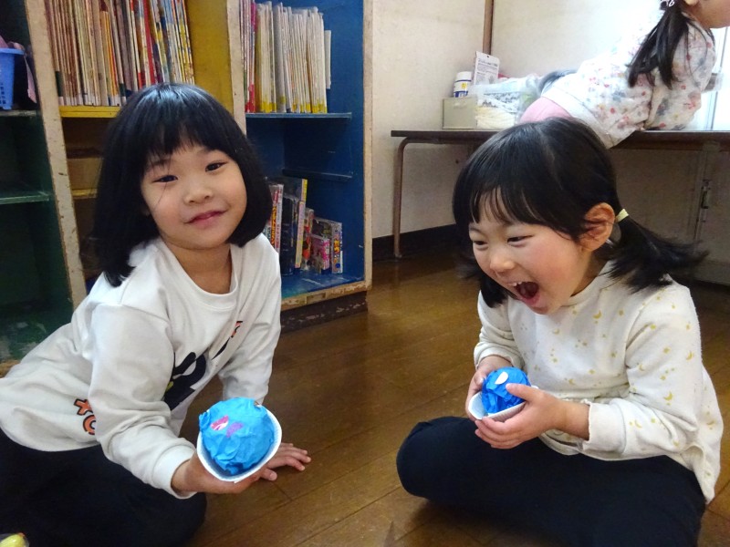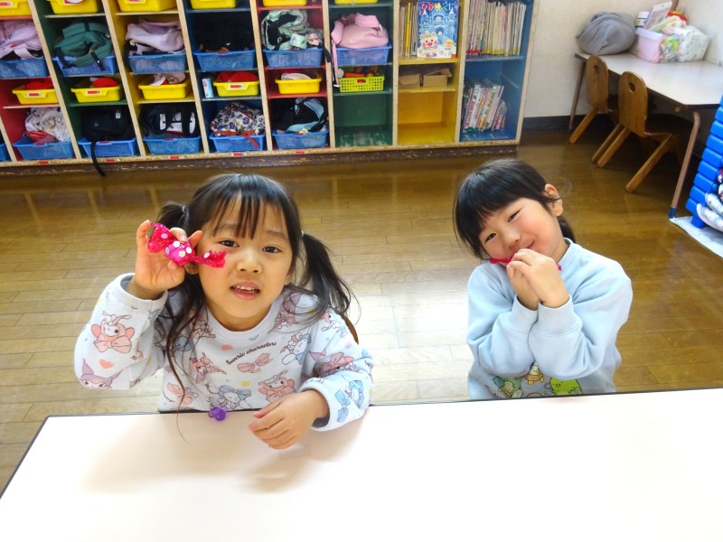もうすぐ節分!かんたんな節分の話を聞き、鬼さんをつくりました。のりで顔のパーツを貼りつけたり、スポイトで色水をたらして色付けしたりして表情豊かなかわいい鬼たちが完成しました。素材に触れ、感性や表現する力を育んでいきたいです。 |