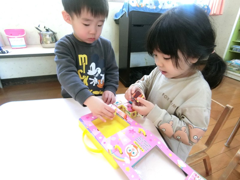 ゙友だちと一緒に゙が増えてきた子どもたちは、「〇〇ちゃん、あそぼう」「仲間に入れて」等自分から友だちを誘ってあそぶことが多くなりました。ごっこあそびや人形あそびなど色々なあそびを楽しんでいます。難しいパズルでも友だちと協力して完成させ、とても嬉しそうですよ。 |