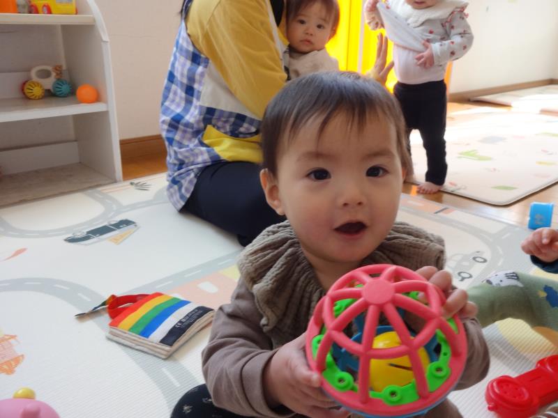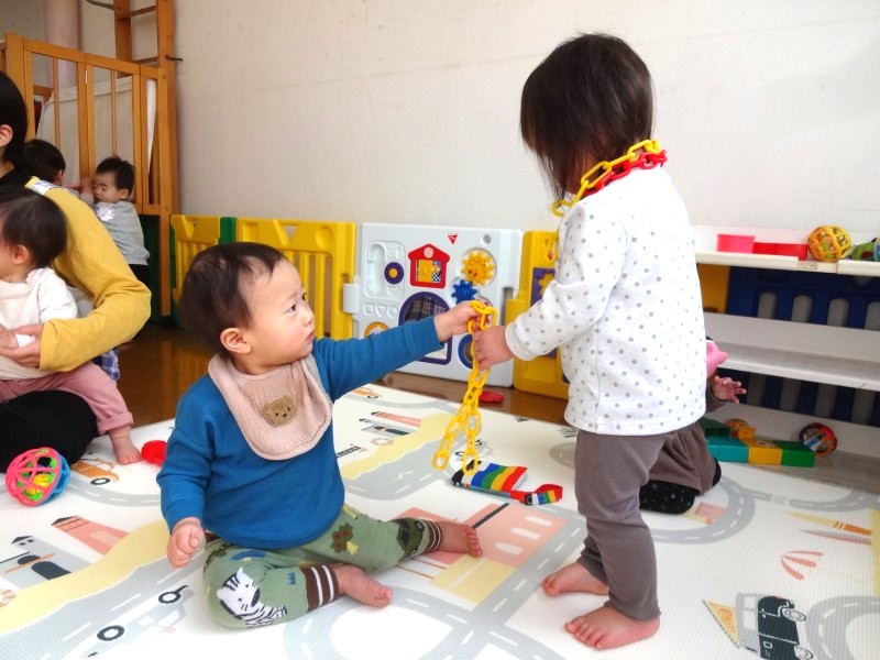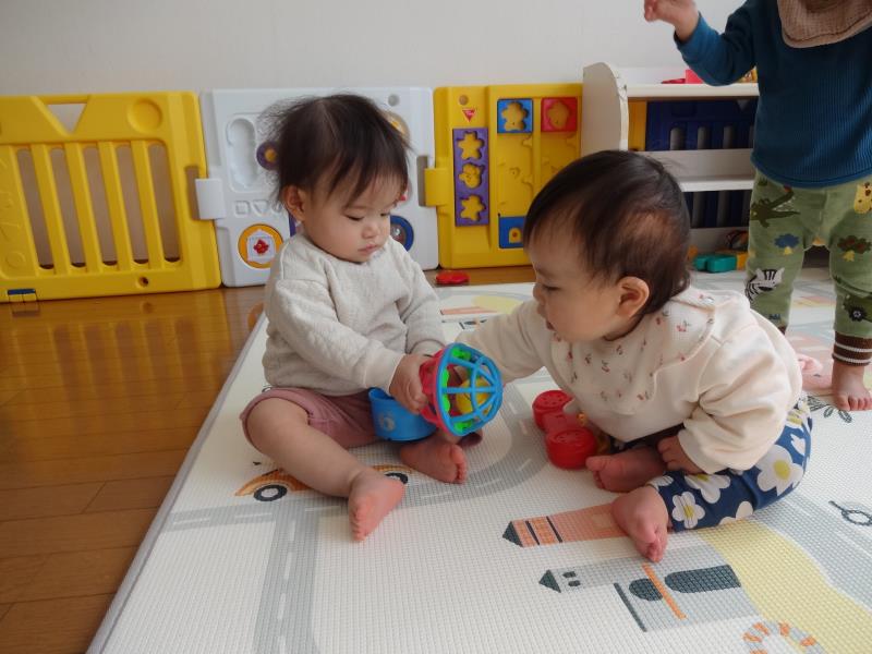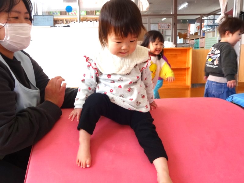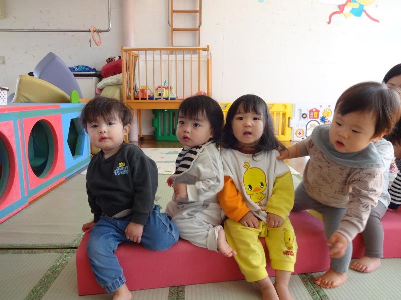 玩具を゙どうぞ゙と渡したり、高いお山のマットに登るのに挑戦したりできるようになりました。お友だちとのかわいいやり取りや出来ることが増えてきて、ますます賑やかなちゅうりっぷぐみです。 |