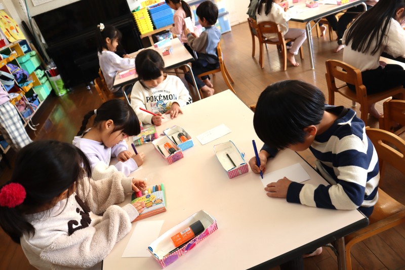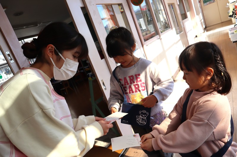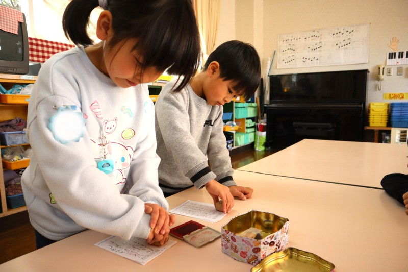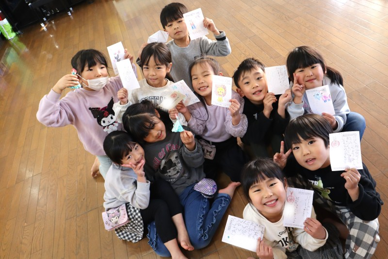 コツコツと取り組んできた文字ワークを終えひらがなが書けるようになりました。ずっと子どもたちが「早くしたいなぁ」と言っていた「郵便ごっこ」を楽しんでいます。絵を書いたり、メッセージを書いたりみんな相手を思い、心を込めて一生懸命書いています。 |
