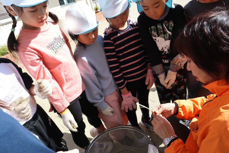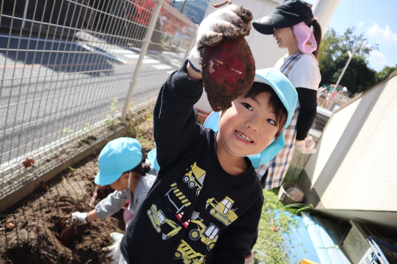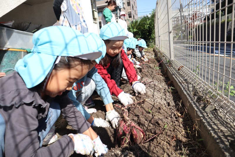 先日、待ちに待った芋掘りをしました。今年の夏の暑さにさつま芋の出来栄えがとても心配でしたが、無事に収穫できてにっこり笑顔の子どもたちでした。収穫後は園長先生に教えてもらってさつま芋の茎(芋づる)の筋取りにも挑戦!!芋づるは給食室の先生に調理してもらい美味しくいただきました。 |