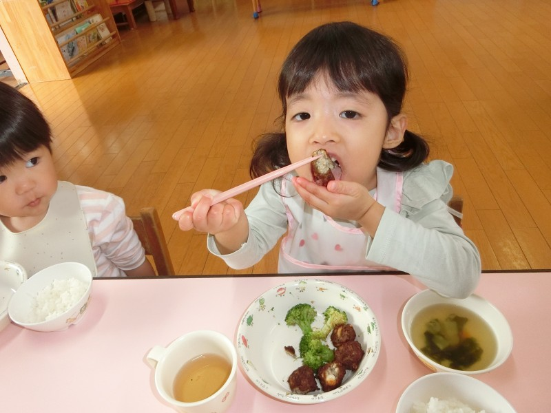 子どもたちが大好きな美味しい給食の時間ですが、スプーンやフォークを上から握って食べていた子どもたちも徐々に下から持って食べられるようになってきました。「バキューンの持ち方ね」の声かけをしなくても自分たちで意識出来るようになってきたので、次はお箸に移行出来たらいいなと思っています。 |