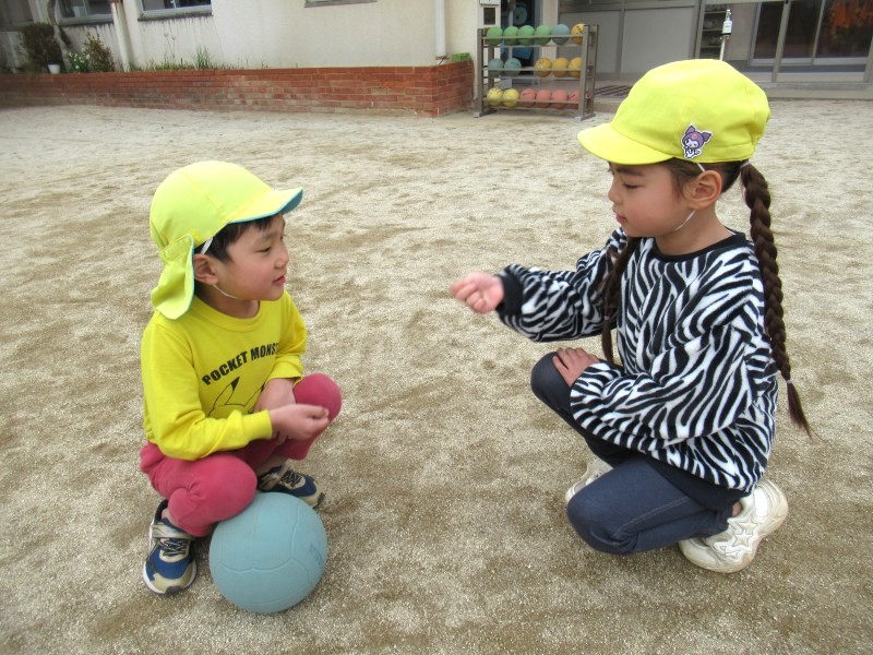 あごがれのさくらさんがやっている゙ドッチボール゙に少しずつ興味がわいてきて、みんなでただ今練習中です。ルールはわかっているんだけど、思うようにボールを投げられなかったりうまく逃げられなかったりして、「んんっ」となりながらも楽しんでいます。 |