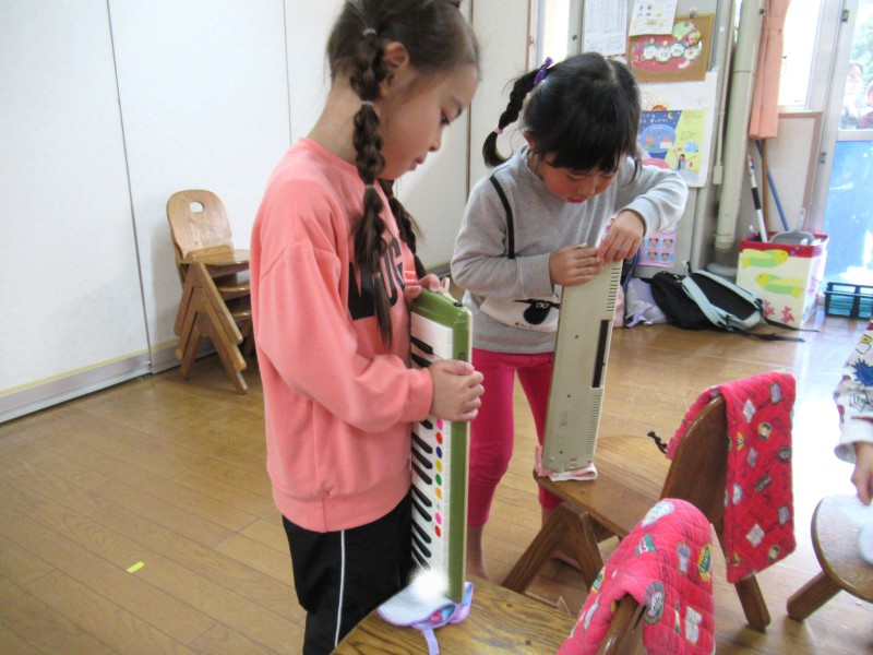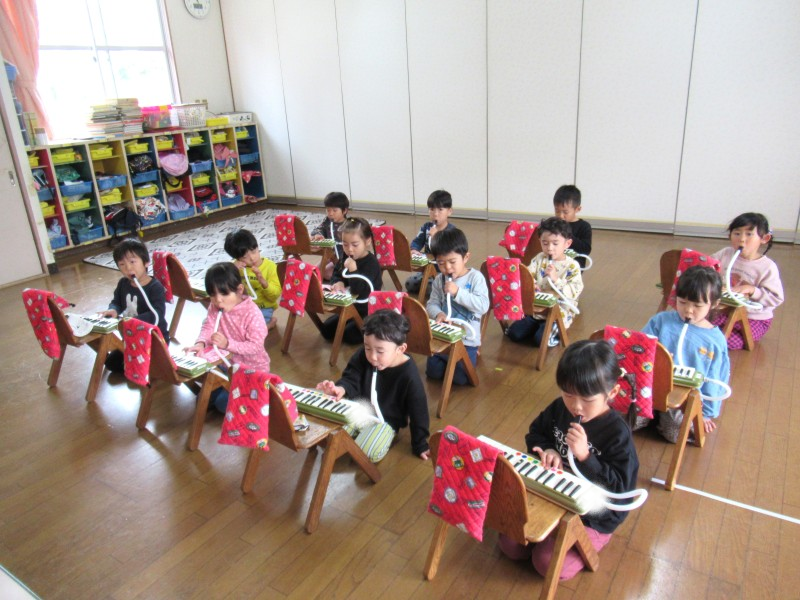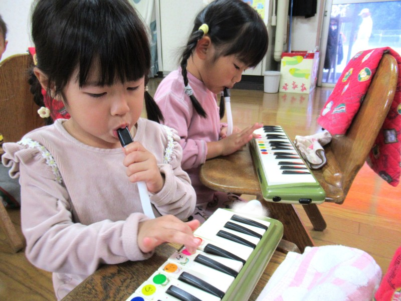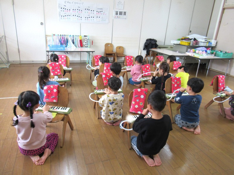 楽しみにしていた鍵盤ハーモニカに挑戦中の子どもたち!!初日から使い方やホースの付け方、息の出し方などたくさん覚えることがありましたが、みんな真剣に話をきいていましたよ。「ドはここかな?」「1番の指よね?」等、子ども同士でも確認し合う場面もチラホラ。音が出た喜びから今は音が合う楽しさを感じながら取り組んでいます。 |