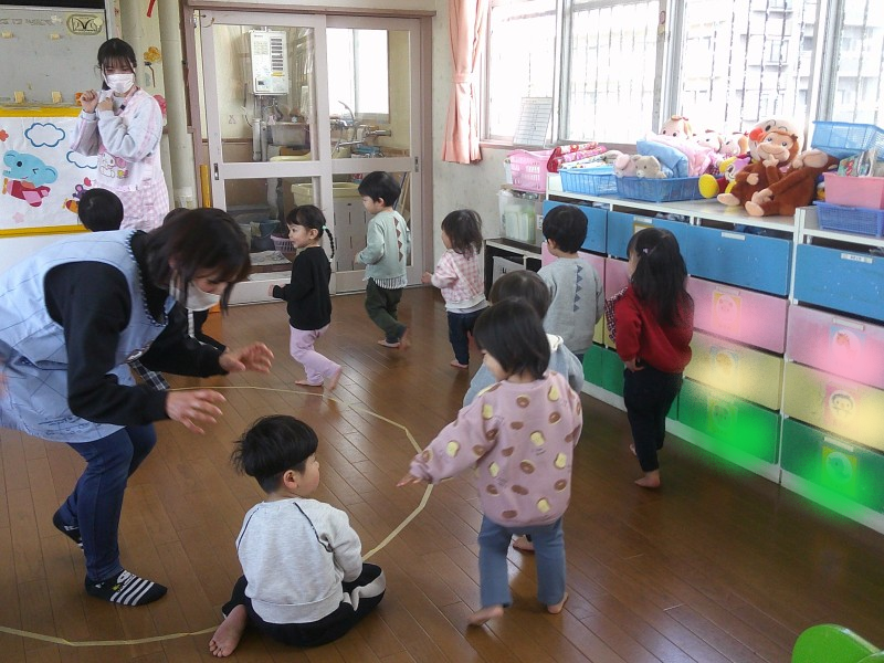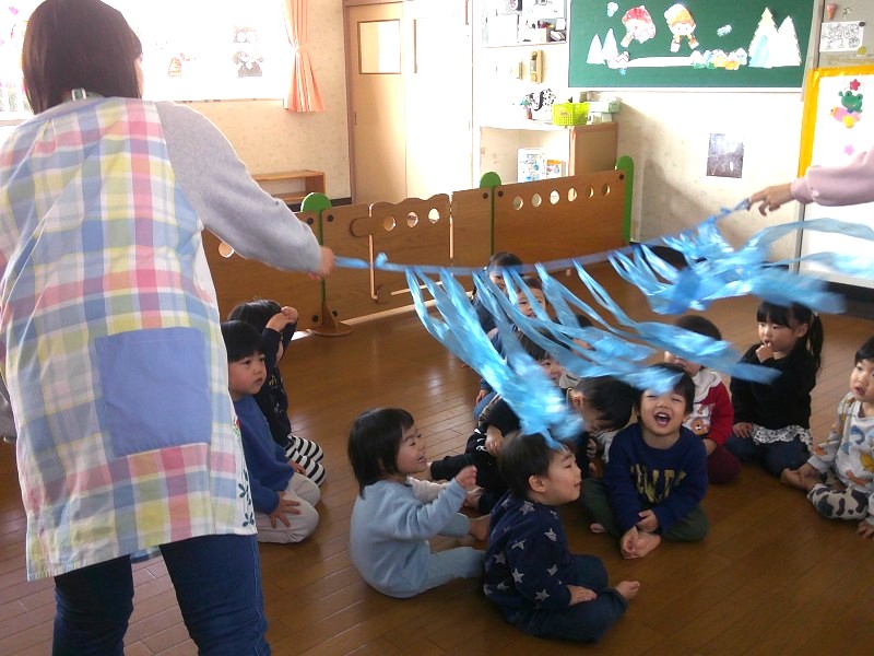 戸外や運動あそびの中で身体を動かして楽しんでいます。挑戦する気持ちやできた喜び、できない悔しさなどいろいろな気持ちが育っているうめぐみさん♪寒い冬も元気いっぱい吹き飛ばす勢いです!! |