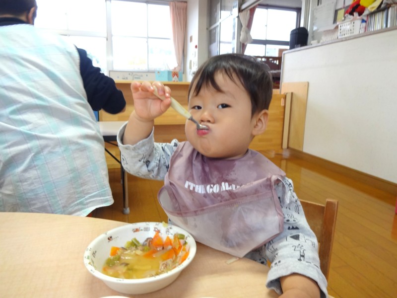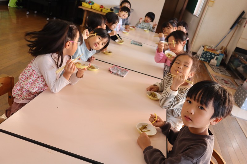 食欲の秋♪給食の時間になると「いただきます」「おかわりください!」という元気な声が聞こえてきます。お箸の持ち方も意識しながらたくさん食べていますよ! |