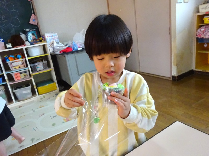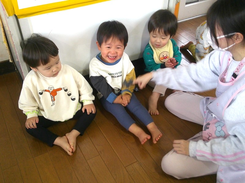 外に行くときには、上着を探したり靴を履こうとしたりと、やる気満々で準備をするようになりました。マジックテープやファスナーに苦戦しながらも自分でやろうと頑張っています。子どもたちのやってみたい気持ちを大切にして、身の回りのことへの挑戦を見守っています。 |