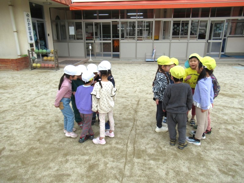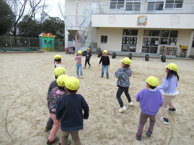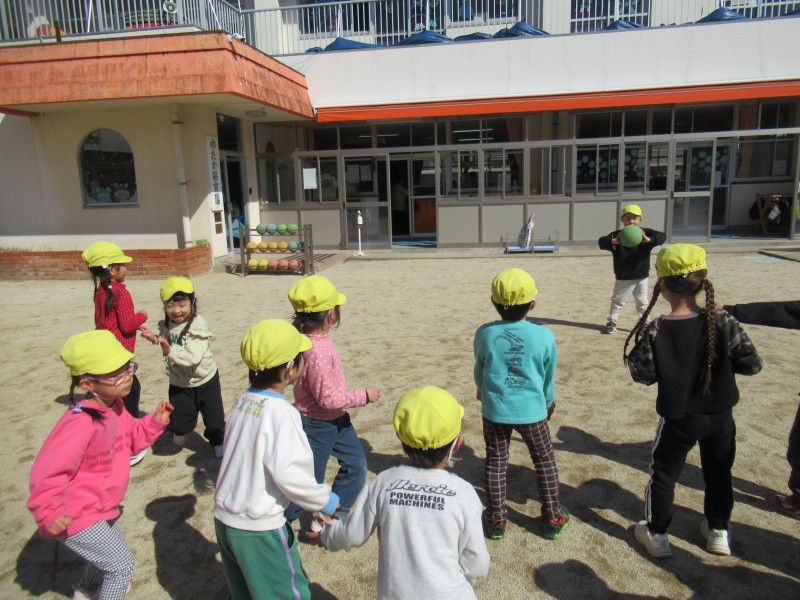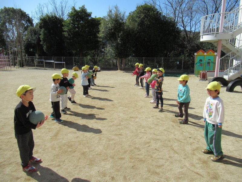 お遊戯会も終わり一段と成長したすみれぐみのこどもたちは、寒さにも負けず園庭であそぶのが大好きです。園庭では、ボールを蹴ったり、保育教諭と一緒に追いかけっこをしたりして楽しんでいます。体をたくさん動かし、強い身体作りを目指して元気にあそんでいきます。 |
