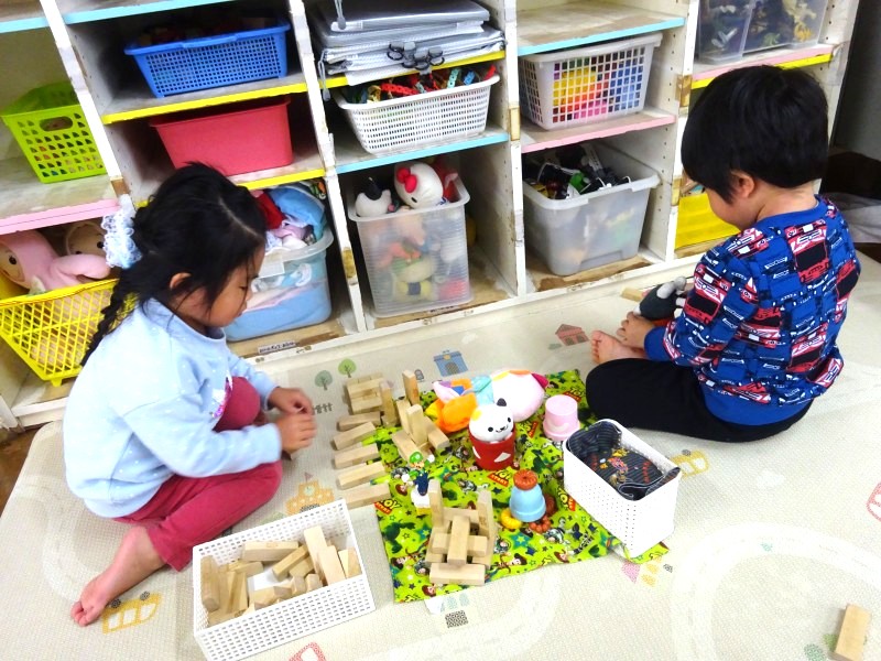 就学に向けて9月から午睡(昼寝)をしなくなった分、その時間は室内あそびを満喫しています。子どもたちに一番人気なあそびは「ラキュー」色々な色のパーツを上手に組み立てて、大人が思いもしない作品が次々と出来上がっています。子どもたちの自由な発想力にはいつも感心させられます。 |